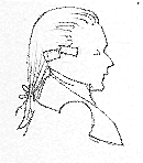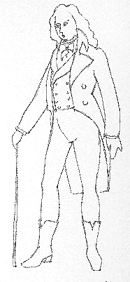 Gentleman of the late 18th century in Van Dyke curls, frock coat and pantaloons.