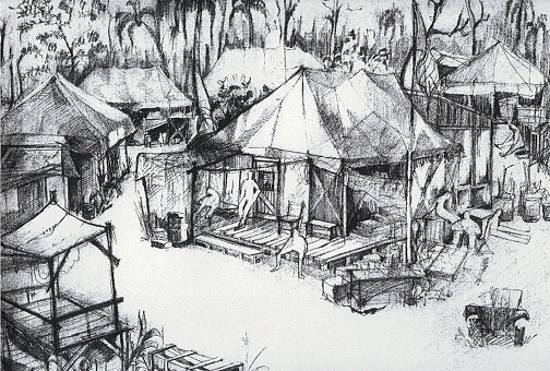 Two sketches for scenes from the early version of the film Day of the Dead. The tent city, above, was written out of the script; the council chamber was used. |