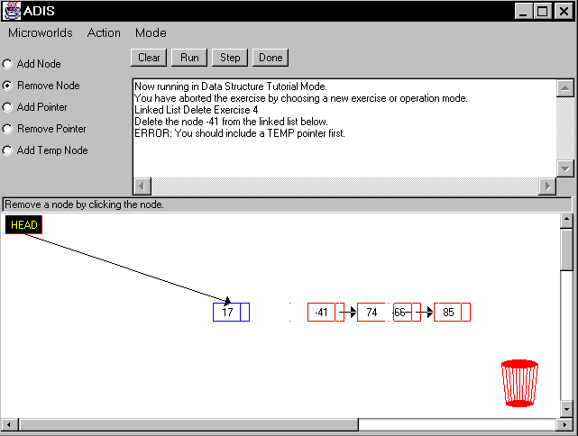 In the exercise discussed above, the student always executed the correct action. This means that the Expert always found a match in its template for each step, and thus the tutor never activated to provide any pedagogical instruction besides displaying encouragement and storing the action information in the Student model. This is ideal, but will not be the norm, especially considering that the students targeted to use ADIS would be relatively new to data structures.