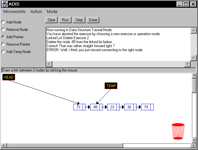 Assume the student proceeds to do the correct action of adding a TEMP pointer. Then the student connects the TEMP pointer to the second node (value -85). A constraint is violated as the exercise requires the TEMP pointer to be connected to the third node. Any further monitoring by the expert would therefore be unnecessary, as further student inputs would not be coherent based on this linked list. The expert can immediately provide instruction to the student regarding the violated constraint, without any further action or information from the student. The Expert will respond with the appropriate tutoring message and will also retract the incorrect move made by the student (see Figure 4).
