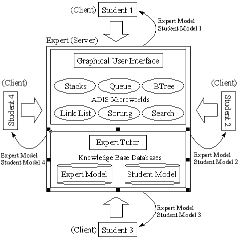 Figure 1 gives a general schematic representation outline to the ITS. Currently every user has his own copy of the Expert and Student model. In the future development of ADIS there will be many student hosts (clients) but only one central expert (server). Each student still has his/her own Student model but all will use the same copy of the Expert model in the Expert's Knowledge Database. The Data Structure Modules available can be easily expanded by adding new microworlds to the system. The prerequisite for this is laid by defining a general communication protocol and implementing the tutor engine without any knowledge about the domain being taught.