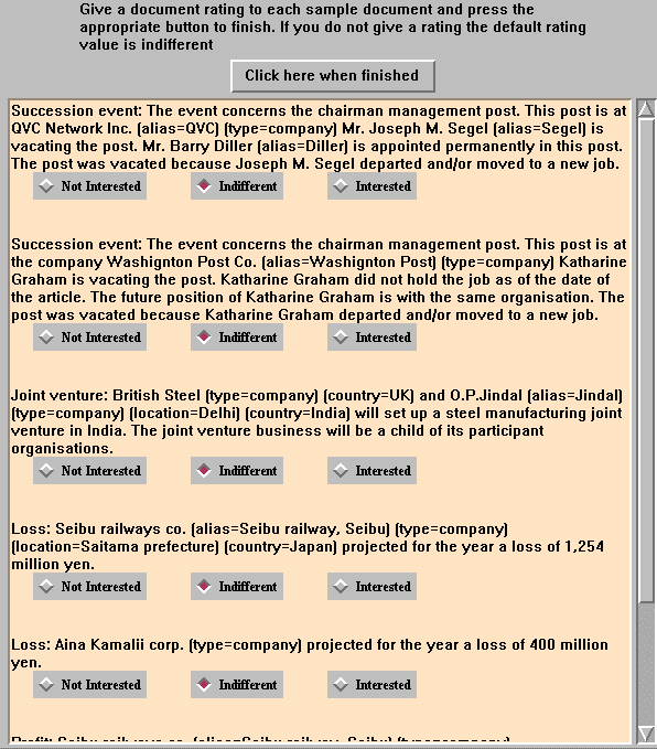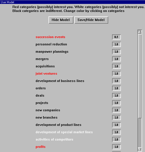 The user can also state explicitly his interest/ indifference/ disinterest in the domain categories (Appendix, Screendump 2). Explicit information increases or decreases the confidence factor of the domain categories. The user can also explicitly specify the values of one or more of the categories attributes. For example, he can specify that he is interesting in management successions concerning chairmen (management post = chairman) .